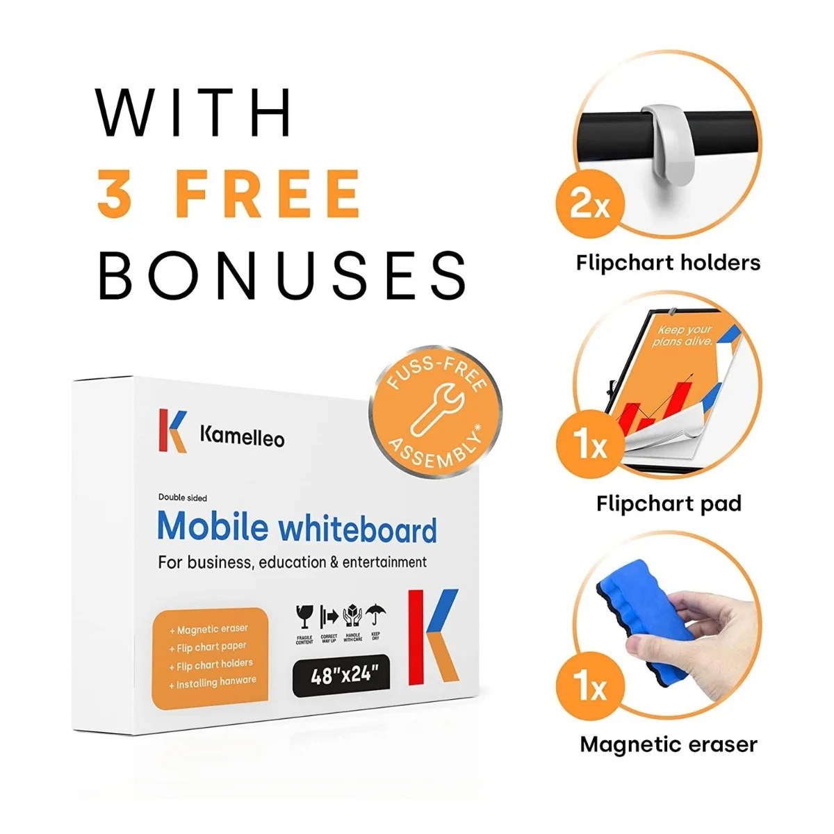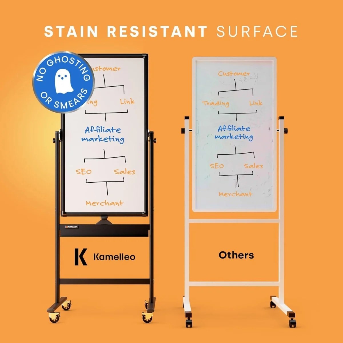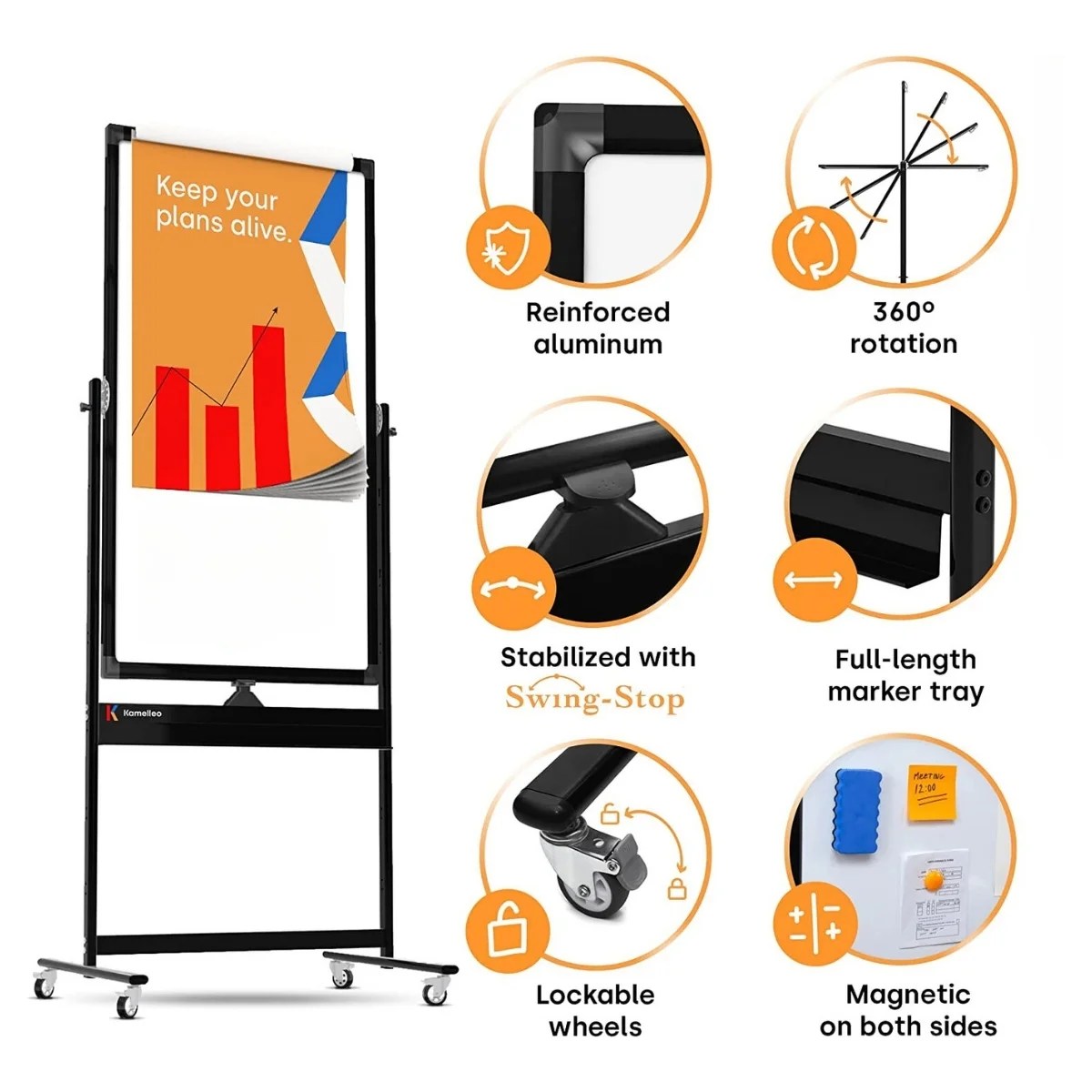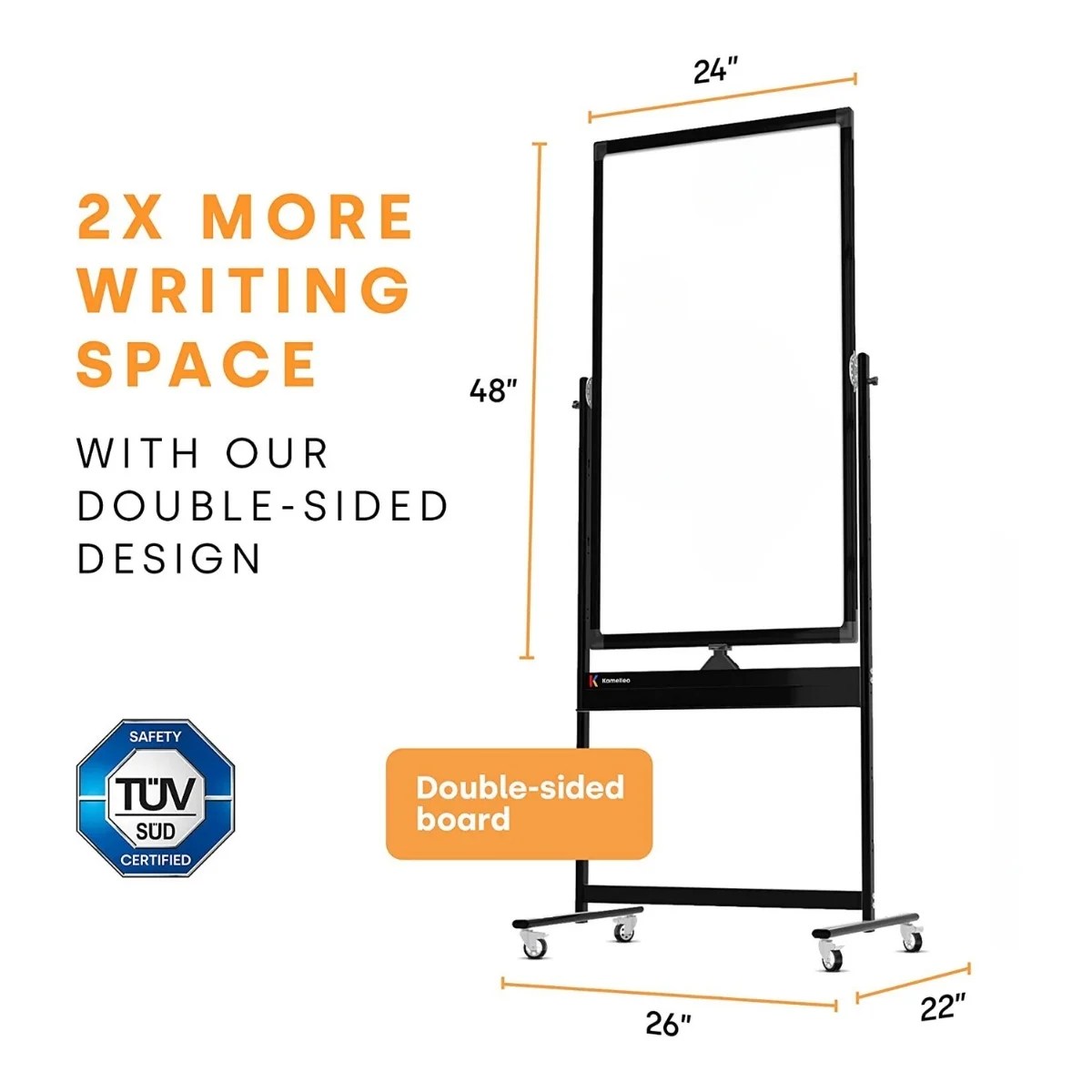 - 🖊️ DOUBLE-SIDED FOR MAXIMUM PRODUCTIVITY: This board provides two large writing surfaces, allowing you to flip between sides seamlessly. Whether you’re outlining strategies, tracking progress, or mapping out ideas, you’ll have ample space to keep your work flowing without constant erasing.